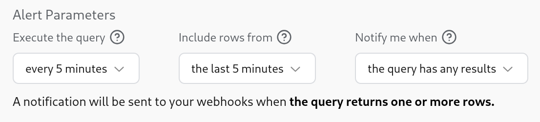 You can adjust when alerts are sent based upon the alert parameters. With this style of alert, we just want to know if anything within the last 5 minutes has been slow. So we can use the following options: - Execute the query: every 5 minutes